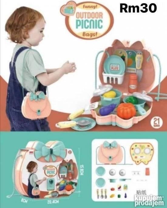 Ovaj zanimljiv komplet torbica pruža vašem detetu zabavu i iskustvo u navedenom području. Pomaže vašem detetu da razvije mentalni rast i poboljša veštine učenja a u isto vreme ovaj komplet će služiti detetu za igranje u kući i na otvorenom. Ovaj set torbi pogodan je za decu stariju od 3 godine jer je napravljen od sigurnog i izdržljivog materijala. Takođe bi bio pogodan kao poklon za vašu decu rođake i prijatelje. Set sadrži pribor za kuvanje tanjiriće pribor za jelo povrće. . . a uz to je jako privlačna torbica za vaše dete. Ukupno delova u setu Piknik na otvorenom (21 kom)  Materijal: ABS Plastika Veličina pakovanja: 21×16×8 cm Pogodno za uzrast: 3 godine i više : Sms porukom na   ili preko KP aplikacije Možete da lično preuzmete na Omv pumpi u NBGD-u blok 70 –pogledajte i naše oglase klikom na opciju svi oglasi – –