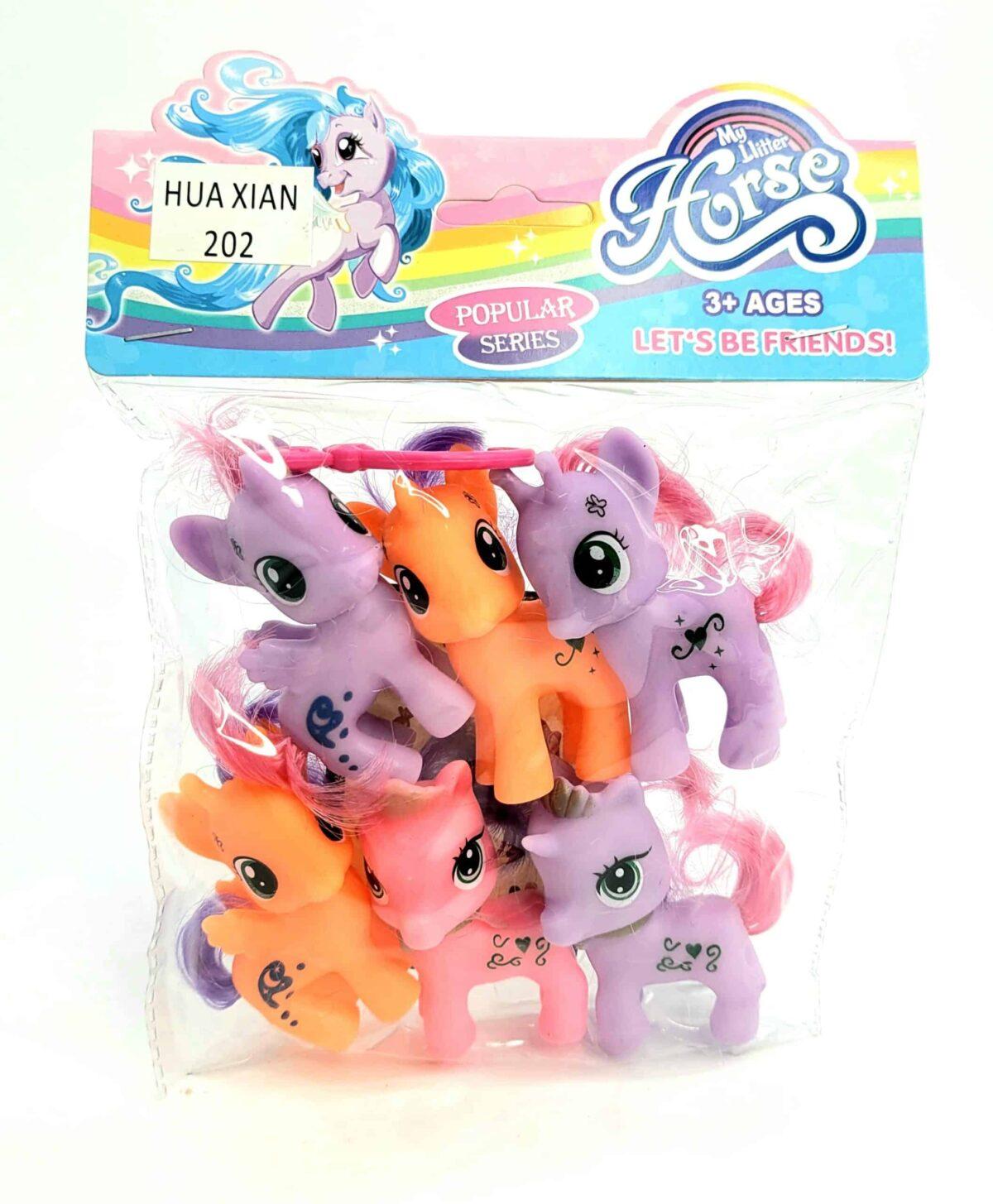Set od sest fugirica Mali poni se sastoji od tri ljubicsta, dva narandzasta i jednog roze ponija sa stikerima koji sluze za ulepsavanje i dodavanje detalja, kao i cesljicem za cesljanje repa i grive. Svi poniji su razliciti bez obzira na boju imaju razlicite detalje a stikeri po zelji se mogu lepiti po telu malih ponija. Velicina ponija visina 6,5cm. Igracke su napravljene od tvrde i kvalitetne gume i bezbedne su za igru dece 3+ godina.
