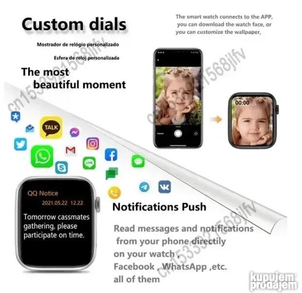 Pametni sat i8 Pro Max – Najnoviji pametni sat serije 8 Pro sa odličnim karakteristikama. Boje: Crna Bela Roze Crvena Teget. Specifikacija: -Veličina ekrana: 175 inča HD -Rezolucija: 328 X 380 RGB -Tip ekrana: Osetljiv na dodir -Aplikacija: Da Fit -Podržani sistemi: Android 50 (ili kasniji) IOS 90 (ili kasniji) -Bluetooth : verzija 50 -Senzor gravitacije: Ne -Tip baterije: Polimer litijim jonska 200 mAh Podržani jezici: 15 različitih jezika -Bluetooth reprodukcija muzike. -Kontrolišite mobilnu reprodukciju muzike. -Pozovite podršku za podsetnike Funkcije: Izveštaji o vežbanju ( brojanje koraka distanca izračunavanje kalorija) Više režima vežbanja Merenje otkucaja srca saturacije i krvnog pritiska Praćenje spavanja Podsetnik za poruke Podsetnik za pozive Sinhrono obaveštenje Split screen opcija Budilnik Daljinski upravljač fotoaparata Kontrola muzike itd.
